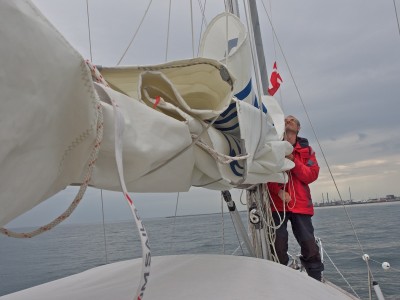 - Fortsatt frisk i Kattegatt. Akterstaget falt ned i Cockpiten.