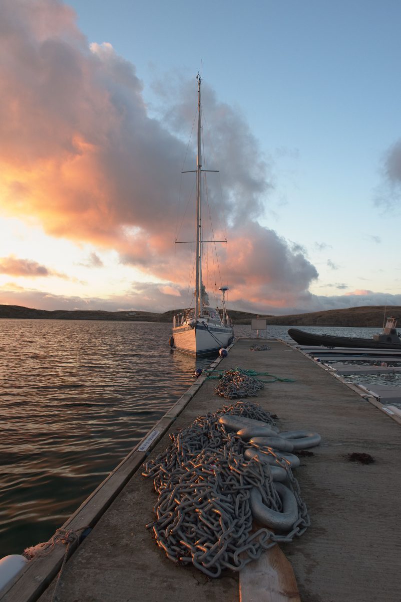 Mit dem Motor sind wir am nächsten Tag weiter nach Fleinvær. Hier war Enno letzten Sommer mit seinen Kollegen zum „havrettsbord“ ( übersetzt so in etwa „Meeresfrüchteessen“). Dabei hat er entdeckt, dass es auf der Insel (Sørværet) eine Gästebrücke gibt. Die Überfahrt ging problemlos, der wenige Wind kommt uns direkt entgegen, so dass wir nicht segeln können, aber das passt uns eigentlich gut, da wir ja die Batterien laden müssen und der Motor sowieso laufen muss. Das Anlegemanöver auf Sørværet hätte leicht schief gehen können: Wir wollten rückwärts einparken, damit wir der Wind von vorne kommt, aber an der Brücke hatte es keine Klampen zum vertäuen und der Abstand zwischen dem Betonsteg und den Holzbrettern, die aussen am Steg befestigt sind, war so schmal, dass ich unser dickeres Tau nicht schnell genug durch bekommen habe. Ich stand also auf dem Steg und Enno ist mit Inua vom Wind abgetrieben worden. Mit dem Kiel ist er leicht über die Kette, mit der der Steg verankert ist, geschrabbt. Zum Glück hat er sich nicht fest gesetzt. Das wäre gefährlich gewesen. Das nächste Anlegemanöver war dann vorwärts und mehr kontrolliert. Alles ging gut, nur leider haben wir jetzt den Wind von hinten und die Wellen klatschen die ganze Zeit gegen das Heck. Das hört man sehr gut im Inneren von Inua – wir machen die Tür zur Achterkabine zu, dann wird es etwas ruhiger.
